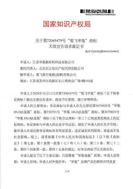 对蜀飞架空地板(成都)有限公司--第72065479号蜀飞华集--无效裁定 20250726